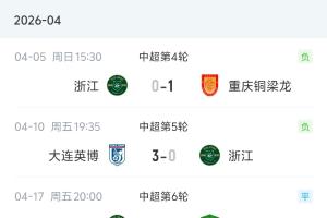 体育资讯04月25日讯 本赛季进入4月以来,浙江队连续5场中超比赛1平4负,且一球未进,净丢10球。 4月以来,浙江在中超先后输给重庆铜梁龙、大连英博、武汉三镇和成都蓉城,仅在主场收获一场0-0北京国安的平局。